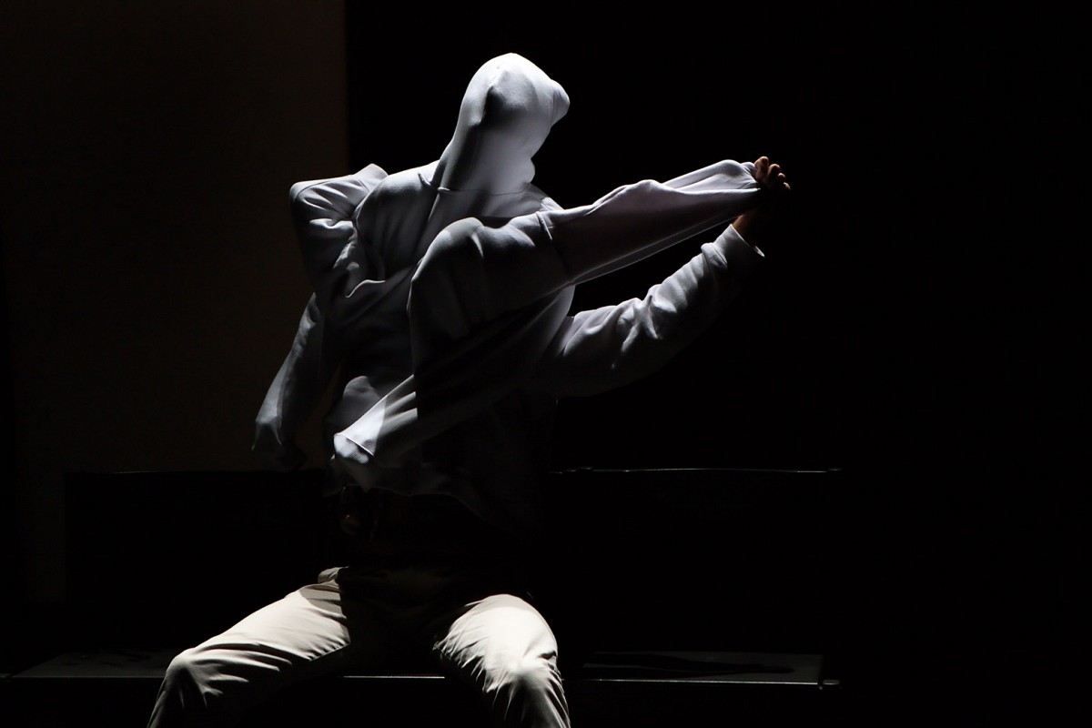 Sur scène, nous observons deux personnages qui s’apprivoisent. L’un est un homme, l’autre semble être son double… Dans un ballet chorégraphié et muet, cette créature apparaît et disparait là où on ne l’attend pas toujours, cherchant à établir le contact. Derrière-vous, la musique jouée en direct accompagne ce tourbillon d’émotions.